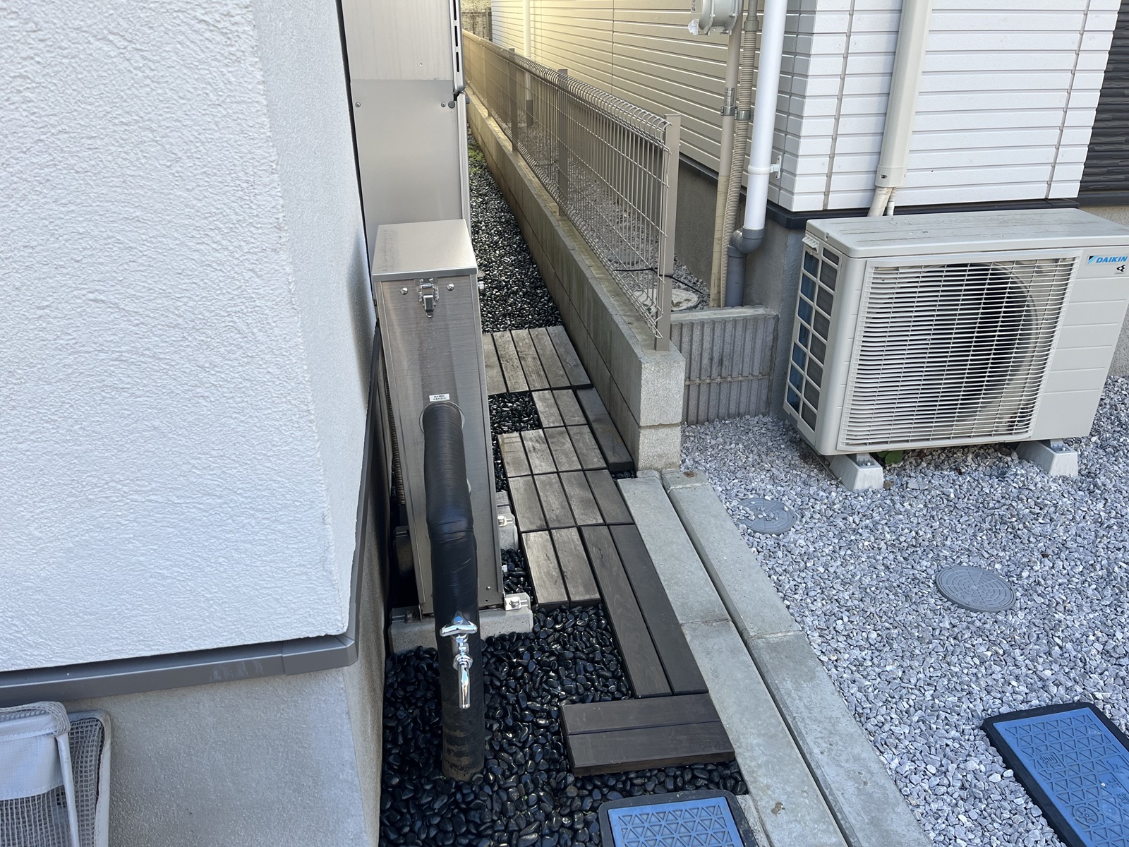 ・先に購入させていただいた、収納ボックス付きフェンスが色合いもふくめ上品でとても好みでしたので、ウッドデッキを同じお色で、また黒石で合わせました(ちなみに写真の奥が庭の裏側にあたり、ちらっとフェンス映っております!)