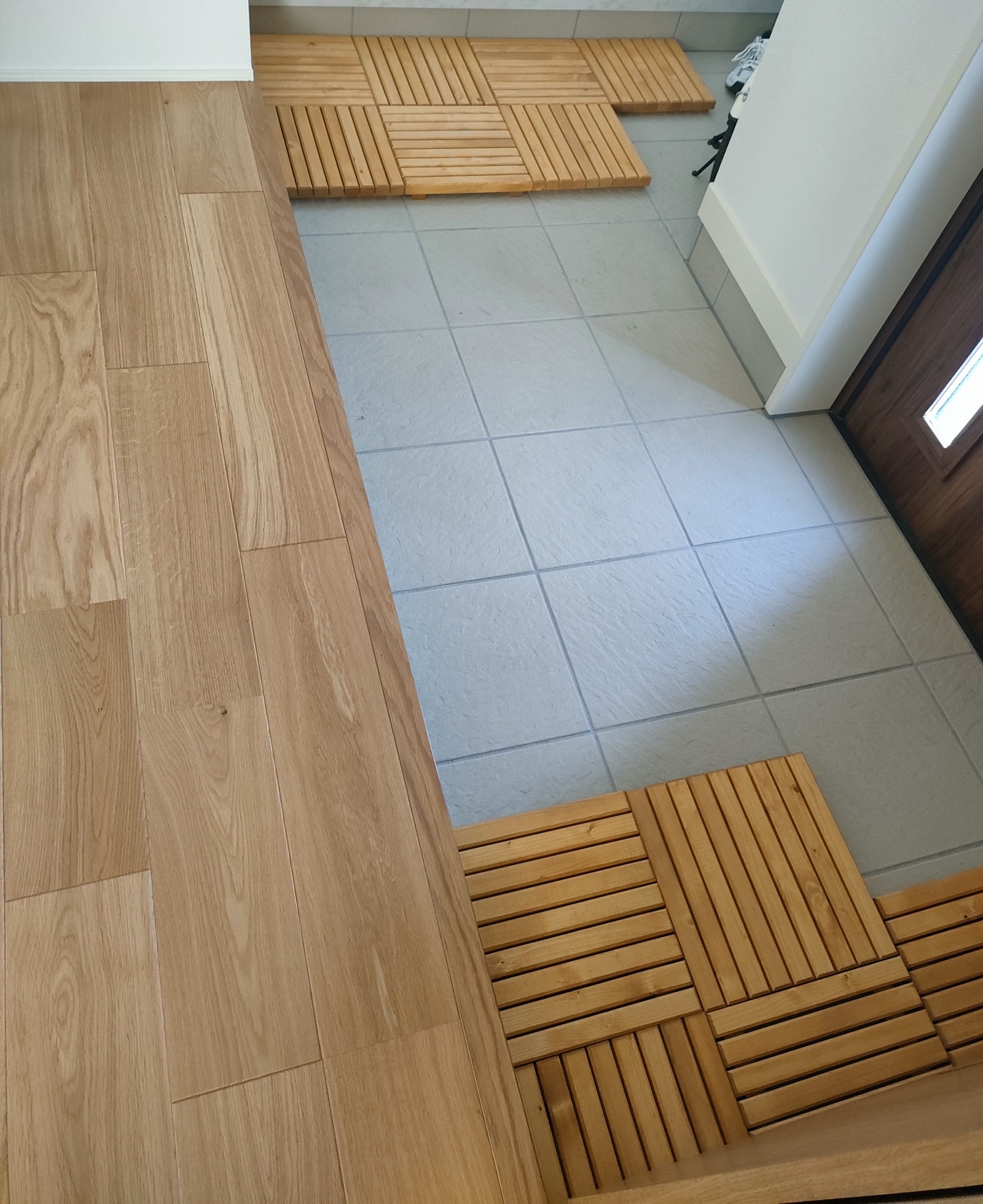 素敵なお写真をお送りいただき、ありがとうございます。玄関の床材の色が明るく、パイン寄りですので、ちょうどよく設置いただいていると思います。ウッドデッキ匠は、表面が滑らかで重厚感もあるため、玄関の格調を邪魔しません。